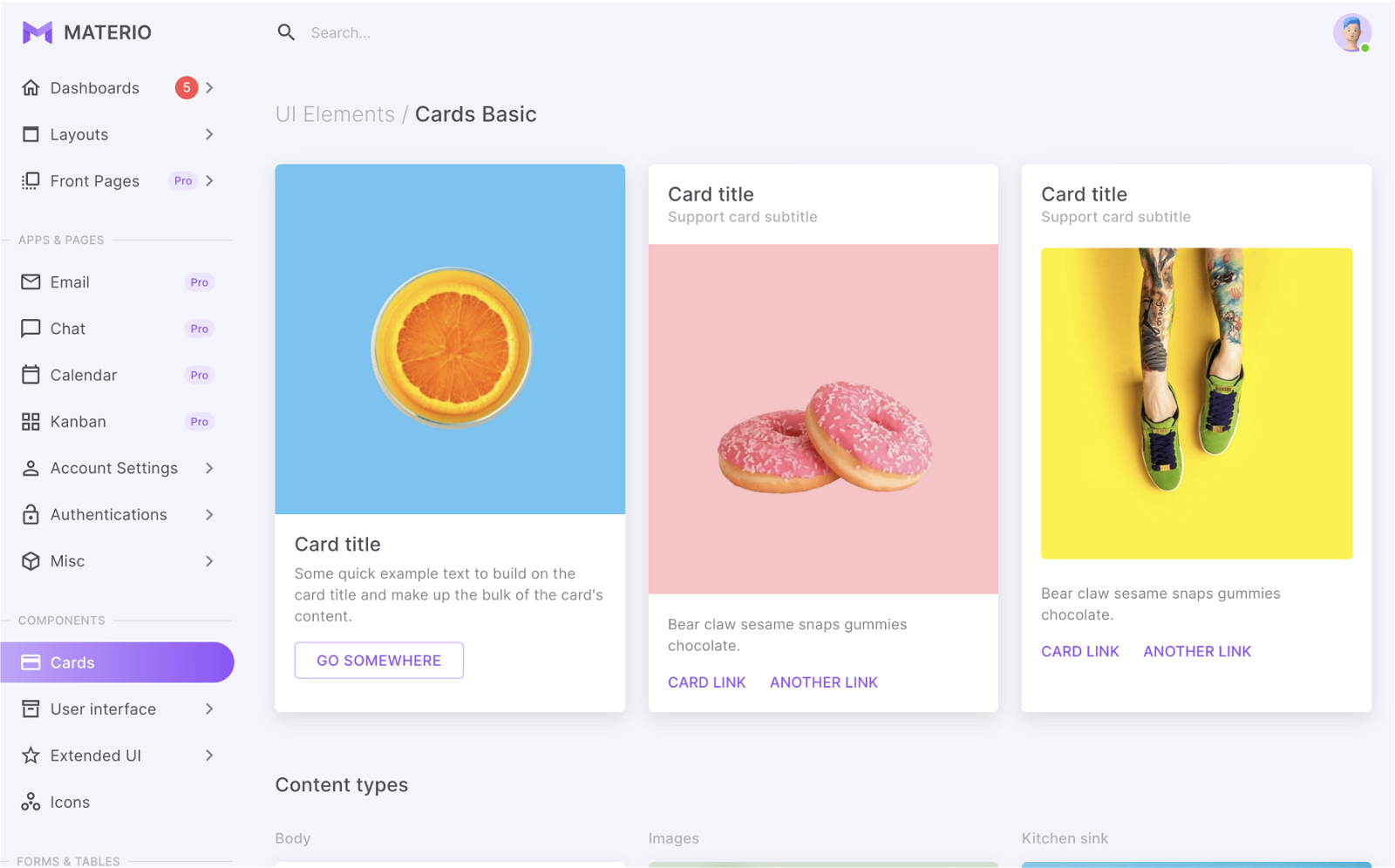 Basic components and pages, including ready-to-use cards, tables & forms.